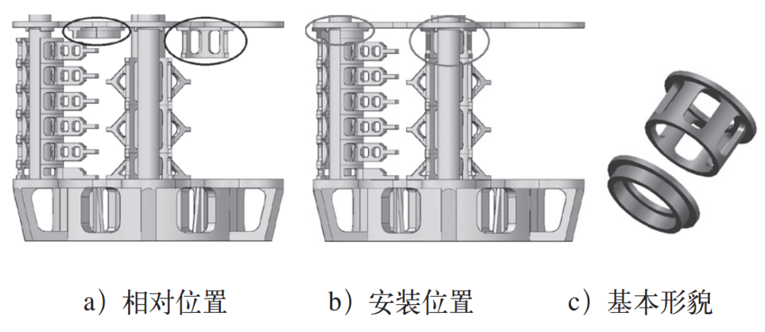 圖11中畫圈位置即為高度補(bǔ)償座,圖11a展示了高度補(bǔ)償座與其他的工裝軸向相對位置;圖11b展示了高度補(bǔ)償座安裝位置,圖中畫圈位置還同步展示了限制中心導(dǎo)向立柱自由變形的定位環(huán)與中心導(dǎo)向立柱的相對位置關(guān)系,以及中心導(dǎo)向立柱與上層托盤的相對位置關(guān)系,還展示了兩層托盤之間的相對位置關(guān)系;圖11c展示了兩種高度補(bǔ)償座的基本形貌。