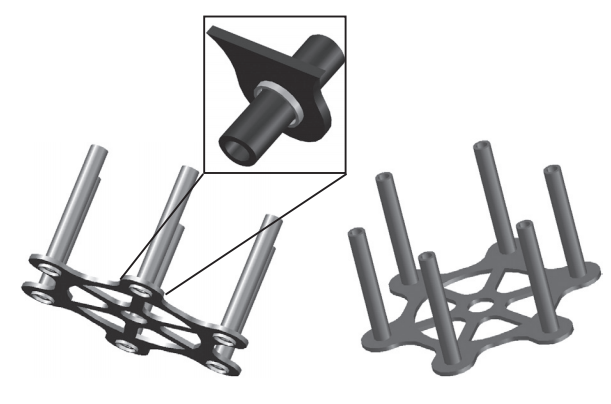 托盤的結(jié)構(gòu)如圖10所示。采用一個大的底托作為承載平臺,6根中心立柱焊在對應(yīng)的位置,底托下部對應(yīng)位置焊有一個限制下一級中心導(dǎo)向立柱自由變形的定位環(huán),其作用方式如圖10中局部放大的小圖所示。