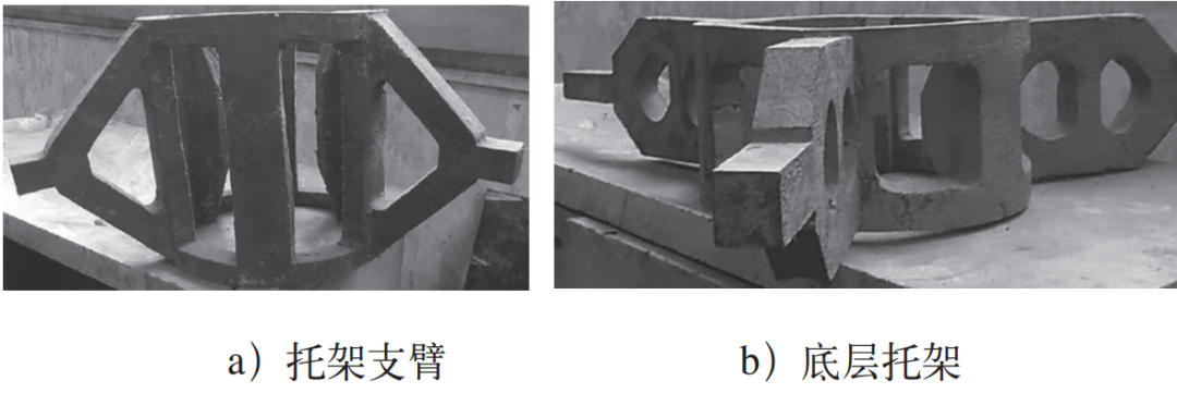 據(jù)此,軸承內(nèi)圈單層托架的初步設(shè)計方案確定為:中心環(huán)內(nèi)徑210mm、壁厚20mm;托架支臂形式選擇圖4a方案;為減輕自重中心環(huán)側(cè)壁開6個減重孔,這主要是因為2個托架支臂之間由于中心環(huán)圓周弧長過長,所以減重孔開成2個,中間保留一個支撐肋。設(shè)計方案試裝成品如圖5c所示。