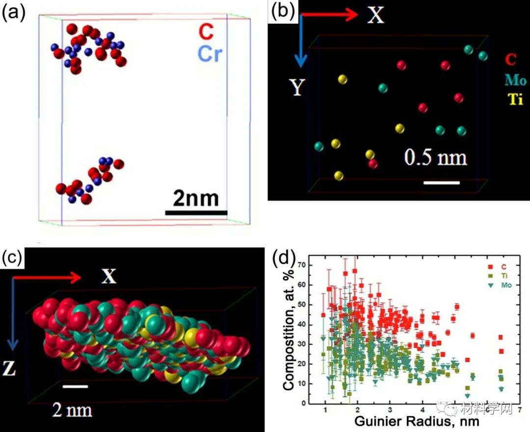 圖2.(a)在熱軋低碳鋼的鐵素體中形成的C-Cr團(tuán)簇的選定原子圖。(b)C-Mo-Ti團(tuán)簇和(c)(Ti,Mo)C析出在C-Mo-Ti鋼的鐵素體中。(d)團(tuán)簇和納米顆粒的溶質(zhì)濃度與在C-Mo-Ti鋼中形成的Gunier放射性的函數(shù)關(guān)系。