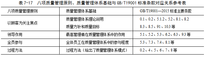 為了清楚地理解八項質(zhì)量管理原則、質(zhì)量管理體系基礎(chǔ)和ISO9001(GB/T1900l)標準之間的關(guān)系,表7-17給出了它們之間的對應(yīng)關(guān)系。
