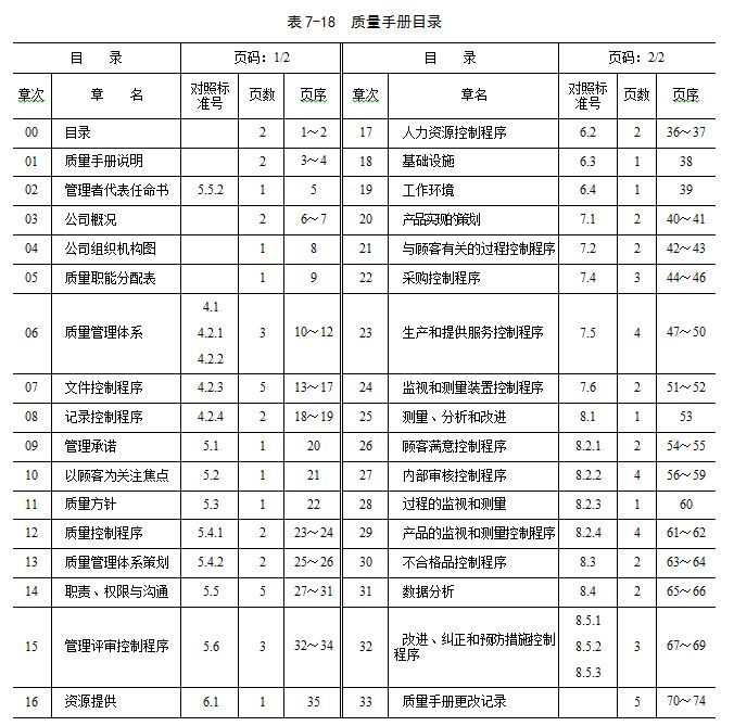 質(zhì)量手冊的內(nèi)容至少應(yīng)包括:質(zhì)量管理體系的范圍,包括非適用情況的說明及對其判斷的理由;質(zhì)量管理體系過程及其相互作用的描述;為質(zhì)量管理體系所編制的形成文件的程序或?qū)@些程序的引用,表7-18為質(zhì)量手冊目錄示例。