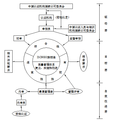 質(zhì)量管理體系的運行機制可分為驅(qū)動層(包括中國認證機構(gòu)國家認可委員會、中國認證人員與培訓(xùn)機構(gòu)國家認可委員會、認證機構(gòu)、審核員)、目標層(企業(yè)的質(zhì)量管理體系)和自我改進層(包括最高管理者、管理者代表、內(nèi)審員)三層。