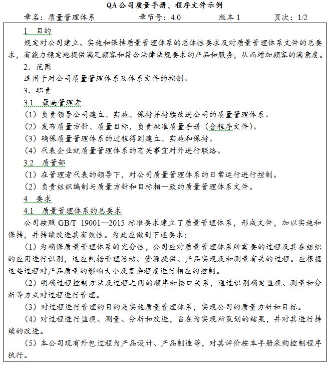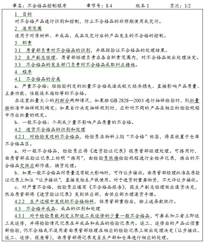 較為詳細的程序文件通常包括文件編號與標題、目的和適用范圍、術(shù)語、職責(zé)、工作流程和控制要點、報告和記錄、相關(guān)文件。