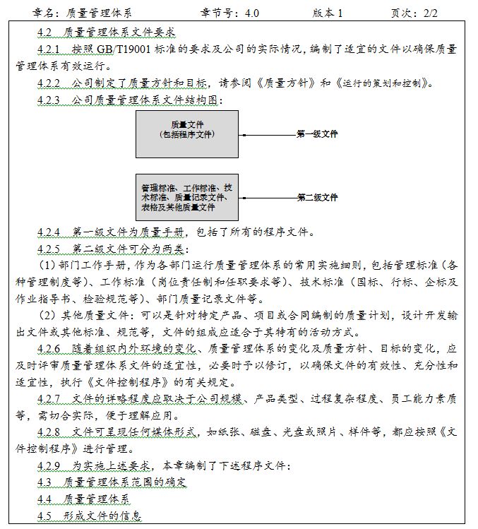 質(zhì)量管理體系文件至少應(yīng)包括:形成文件的質(zhì)量方針和質(zhì)量目標;質(zhì)量手冊;標準所要求的形成文件的程序;組織為確保其過程的有效策劃、運行和控制所需的文件,如質(zhì)量計劃;標準所要求的記錄。