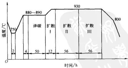 ▲圖21 20CrNiMo鋼人字齒輪的滲層滲碳工藝曲線
