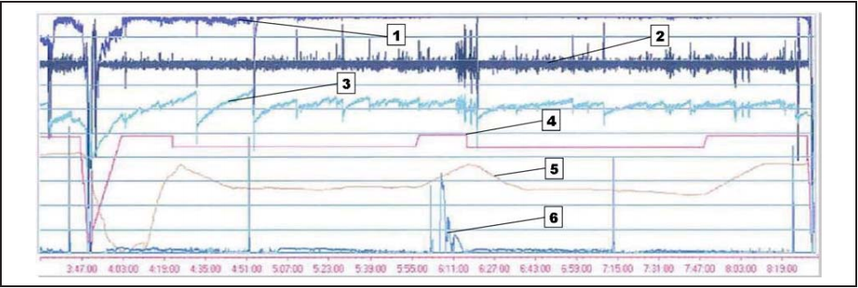 在圖2中顯示了連鑄過程中不同參數(shù)隨時間變化的過程。它顯示了涉及Derthold系統(tǒng)相關(guān)的信號(1),鋼水液面電磁測量系統(tǒng)(2),塞棒位置(3),鑄造測速技術(shù)(4),液相穴位置即凝固末端位置(5)AMEPA渣的信號檢測系統(tǒng)(6)。到最后一爐鋼澆鑄結(jié)束能夠看到,澆鑄周期在3:47 小時和4:51小時之間,塞棒在某個時期上升,這說明水口堵塞現(xiàn)象發(fā)生,然后由于堵塞物被沖洗掉進入鋼中,塞棒表現(xiàn)下降現(xiàn)象。