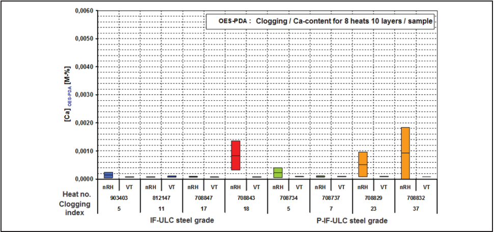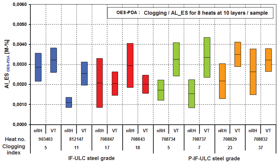 非金屬夾雜物中經(jīng)過RH處理和中間包中8種不同爐號的總鋁量平均值和標準差如圖6所示。圖左邊所示的四個爐號(903403,812147,708847718843)代表IF-ULC鋼級,而爐號708734,708737,708829708832是含磷的IF-ULC鋼種。此外,還提供了一個阻塞指標”(或多或少是一個阻塞指示器)。低值(<11)表示沒有阻塞問題,高值表示明顯阻塞。“AL_ES”的水平與堵塞完全無關(guān)——無論是RH處理后還是中間包中。IF-ULC鋼級與P-IF-ULC鋼級差異不明顯,且分散較明顯。