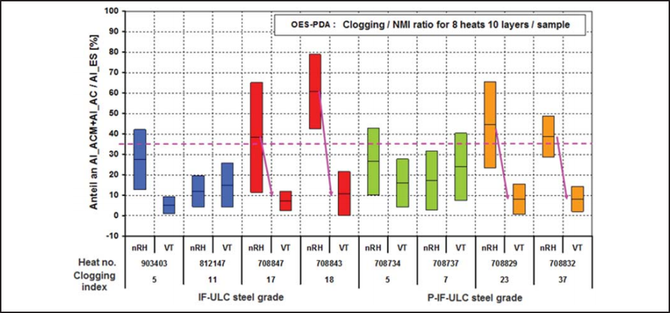 特別是對于鋁鎮(zhèn)靜的IF-ULC鋼種,雖然在液相冶金過程中沒有明顯的差異,但在鋼水澆鑄過程中會發(fā)生堵塞現(xiàn)象。為此,我們對鋼包鋼水處理過程和連鑄過程中采集的試樣進行激光發(fā)射光譜脈沖識別分析(OES-PDA)。某些鋼種之間存在明顯的相關(guān)性,但IF-ULC鋼種目前尚未發(fā)現(xiàn)明顯的堵塞依賴于非金屬夾雜物NMI,一個可能的原因是夾雜物NMI數(shù)據(jù)的離散大,甚至在一個的試樣上離散就很大。