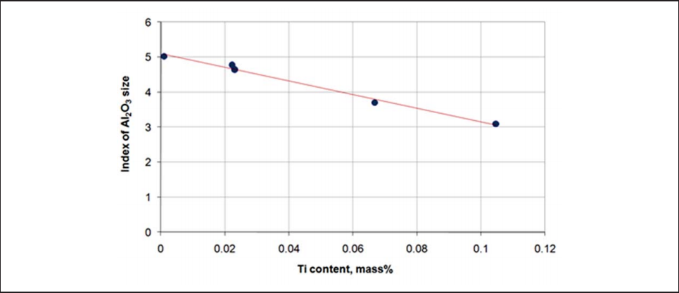 在圖9中可以看到TiAl2O3尺寸的影響,采用OES-PDA5000余種不同鈦含量的ULC鋼水進行了研究,在這種情況下,測量了Al2O3的粒度指數(shù),圖10的分析結(jié)果顯示,隨著鋼水中Ti含量的增加,Al2O3夾雜物的尺寸減小。