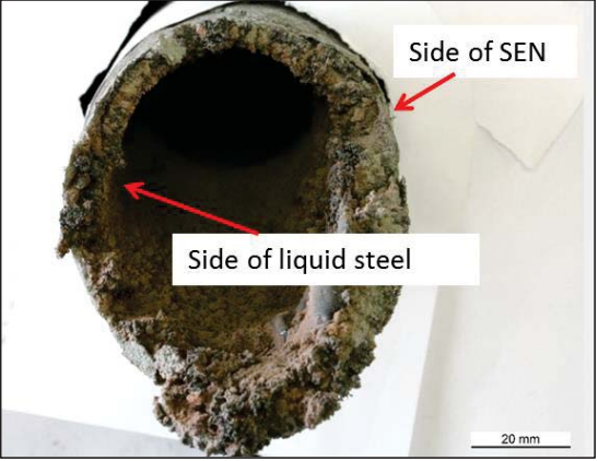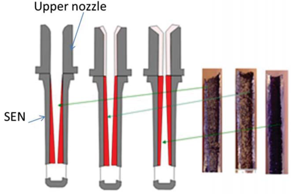 • 沉積從水口上部開始(在塞棒內(nèi)堵塞),并逐漸增加,直到水口的出口。
