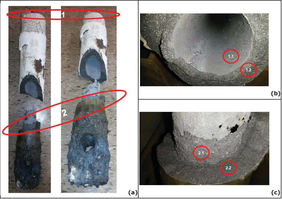 SALZF鋼廠,堵塞主要發(fā)生在塞棒區(qū)域。這是由于使用了抗堵塞水口,在水口內(nèi)徑涂有無碳內(nèi)襯,圖14顯示了一個被堵塞的水口照片,圖14 (a)是水口堵塞總體情況,圖14 (b)堵塞發(fā)生在塞棒區(qū)域,這里的水口內(nèi)部具有涂層,沒有看到堵塞現(xiàn)象,如圖14 (c)所示。