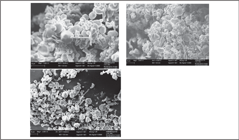 使用掃描電鏡研究阻塞材料的形態(tài)和粒徑,給出解釋的方法。選擇三種不同位置的堵塞材料進行掃描電鏡SEM研究。圖17顯示了這些位置:區(qū)域1靠近水口SEN,區(qū)域3靠近鋼水,區(qū)域2在兩者之間。