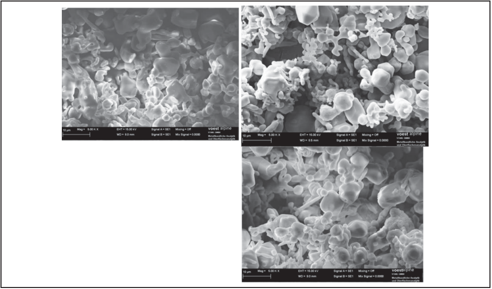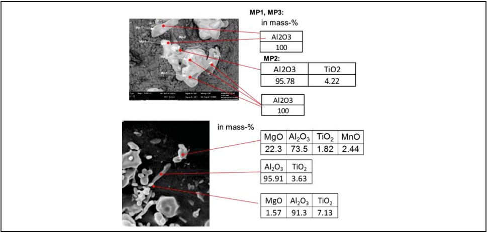 2列出了Al2O3、TiO2MgOFe的含量,區(qū)域1和區(qū)域2的堵塞物中鐵含量在44 ~ 52mass%之間。在靠近鋼水的區(qū)域3中,鐵的含量大約是9%TiO2含量在1.5 - 2.2mass%之間,在所有調(diào)查地點沒有明顯的偏差。區(qū)域1和區(qū)域2的堵塞材料中Fe含量明顯偏高的原因尚不清楚,假設(shè)堵塞材料的形態(tài)起了一定作用。在組織研究中(見上文),可以給出一些信息。IF-ULC的堵塞材料主要是Al2O3,由球狀、樹枝狀和柱狀不同形態(tài)的顆粒組成,這種堵塞材料具有較大的孔隙率,對鋼液的吸收能力較好。無論如何,這是一個有趣的問題,需要更多的調(diào)查,它將提供更多關(guān)于堵塞機制的跡象。