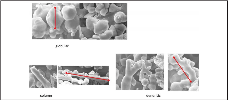 球形占50%,柱狀占35%,樹枝狀占15%,這種觀察是獨立于檢查的位置。