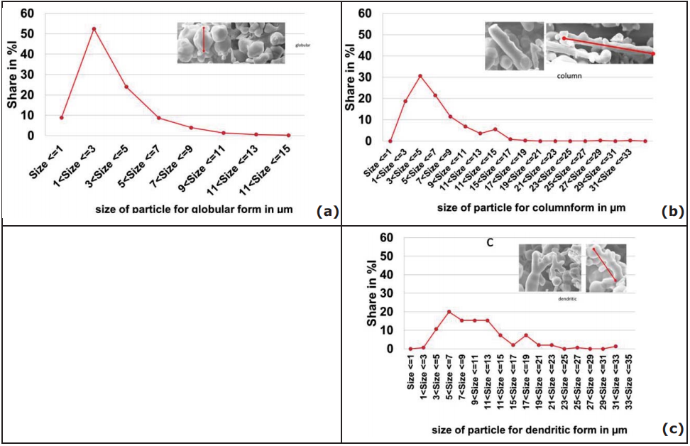 堵塞粒徑結(jié)果如圖23所示,圖23 (a)顯示,超過85%的球狀顆粒的尺寸小于5 μm。從圖23 (b)和圖23 (c)可以看出,超過50%的柱狀顆粒長度大于5 μm,而只有11%的枝狀顆粒長度小于5 μm。