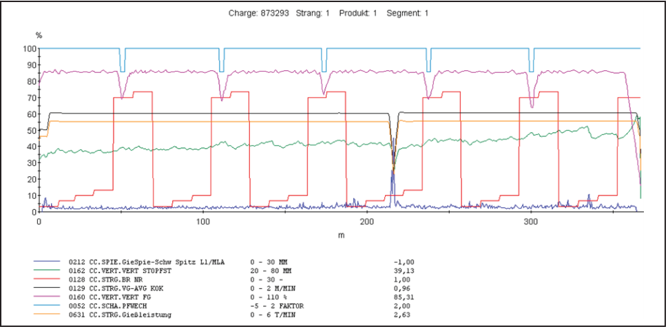 對于一個典型的連續(xù)澆筑6爐鋼Ti-IF鋼種的一個澆次中間包,圖25描繪了最重要的性能趨勢。淺藍色的線給出了鋼包打開開澆(100%)或關(guān)閉(< 100%)的時間。中間包的液面用品紅線表示,品紅線與鋼包滑動水口開口度密切相關(guān)。紅色的階梯函數(shù)給出了板坯的編號。黑線表示連鑄拉速,單位是[m/min],橙色線表示連鑄產(chǎn)能[t/min]。從這兩方面可以得出結(jié)論,盡管所有的澆鑄爐次,連鑄的規(guī)格和產(chǎn)能是不變的,僅僅是在第4爐信號發(fā)生波動,這是表明更換水口。藍色信號是結(jié)晶器內(nèi)鋼水液面位置,最后,綠色的線表示是塞棒的位置。
