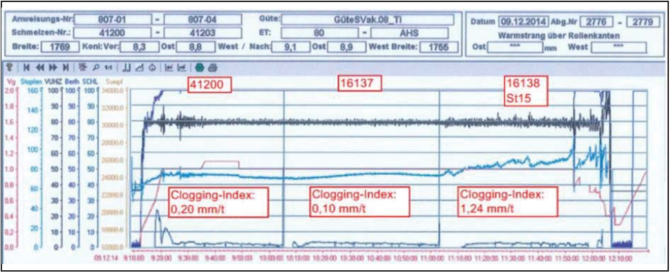 28顯示了幾種澆鑄特性和在SALZF鋼廠連續(xù)三次爐號Clog的評價。塞棒位置用藍色表示,位置變化不明顯,Clog評價值僅為0.10 mm/t0.20 mm/t。第三爐澆鑄時,塞棒位置必須增加,表明出現(xiàn)了堵塞問題。因此,這里對應(yīng)的Clog值為1.24 mm/t