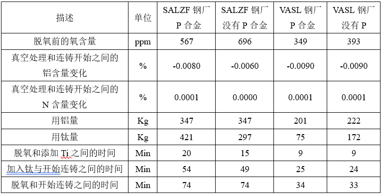 SALZF鋼廠目前的狀態(tài)下,比較新的RH脫氣裝置正在運行,工業(yè)效益的最終判斷是困難的。目前還不清楚RH脫氣裝置是否處在設(shè)計的理想條件下操作。例如,Ti含量及其Ti/ Al比值不在VASL鋼廠較低的范圍內(nèi),這可以在表6和表7中重現(xiàn)。