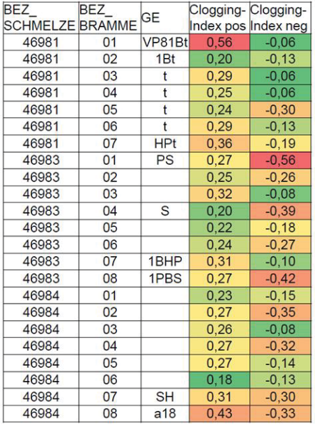 3包含了正阻塞指數(shù)和負阻塞指數(shù)的值,這些值用顏色分開表示。隨后的爐號與大的正阻塞指數(shù),然后一個大的負指數(shù)可以認為絮留物跌落到鋼中。在表3中,46983-01、46983-0446983-08顯示出最為清晰的這種跡象。