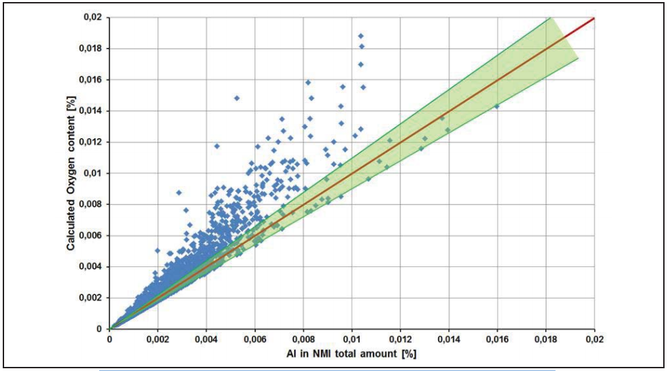 VASL鋼廠,對Ti-IFP-IF鋼級的OES數(shù)據(jù)分類顯示,2016年第一季度數(shù)據(jù)點分散顯著。因此,考慮的數(shù)據(jù)庫在2016年第二和第三季度,數(shù)據(jù)得到了增強。隨后,將OES-PDA數(shù)據(jù)作為所選工藝參數(shù)(Al添加前的氧含量、加AlTi合金化之間的時間跨度、合金添加與RH處理結(jié)束之間的時間)的函數(shù)進行分析。圖30顯示了計算出的氧含量(%)與檢測到的非金屬夾雜NMI總含量(%)的對比。散點圖顯示偏離線性相關(guān)的較大值的計算氧含量。