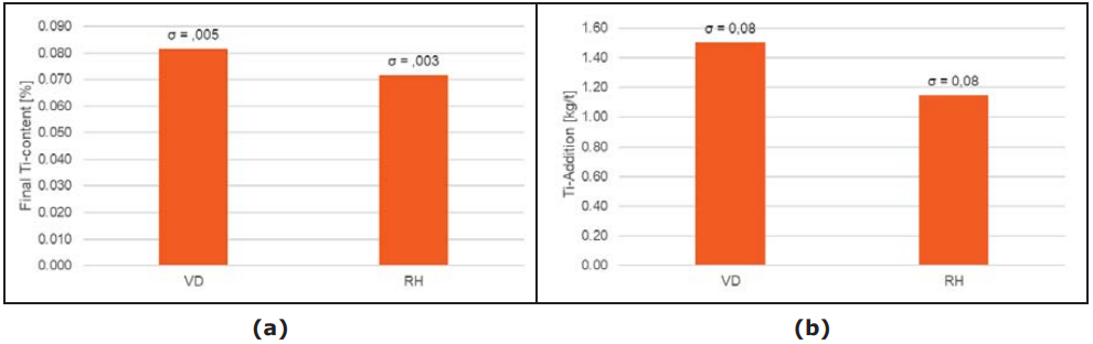 33 對比IFVD路線和RH路線中Ti含量(SALZF鋼廠) (a)平均Ti含量(b)平均Ti添加量