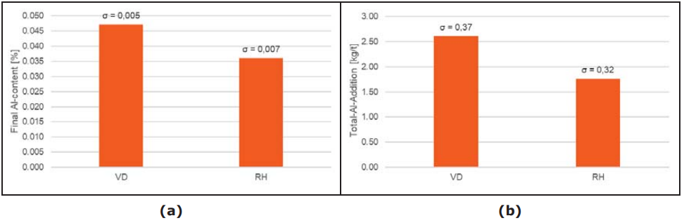在項目運行期間,SALZF鋼廠的工藝路線更改了兩次。早期第一個的變化是對鋼的鈣處理,堵塞問題顯著減少。只有少數(shù)爐號的鋼水沒有進行鈣處理。第二個變化是安裝和實施RH脫氣裝置作為鈦穩(wěn)定ULC鋼的首選工藝路線,由于冶金方面的原因,Ca處理不能應(yīng)用于RH工藝路線??梢詳U展WP4中的分析,使兩條工藝路線在同一連鑄機上生產(chǎn)進行比較。對于上述比較,781爐號的VD路線和697爐號的RH路線的評估在SALZF鋼廠進行。圖32顯示了VD路線和RH路線的平均Al含量和平均Al添加量。RH工藝路線鋁含量較低,Al添加量也低。但鋁的收得率,即鋁含量與鋁添加量的比值,提供了較多的鋁的利用率方面有用的信息,RH工藝鋁的收得率要高15%