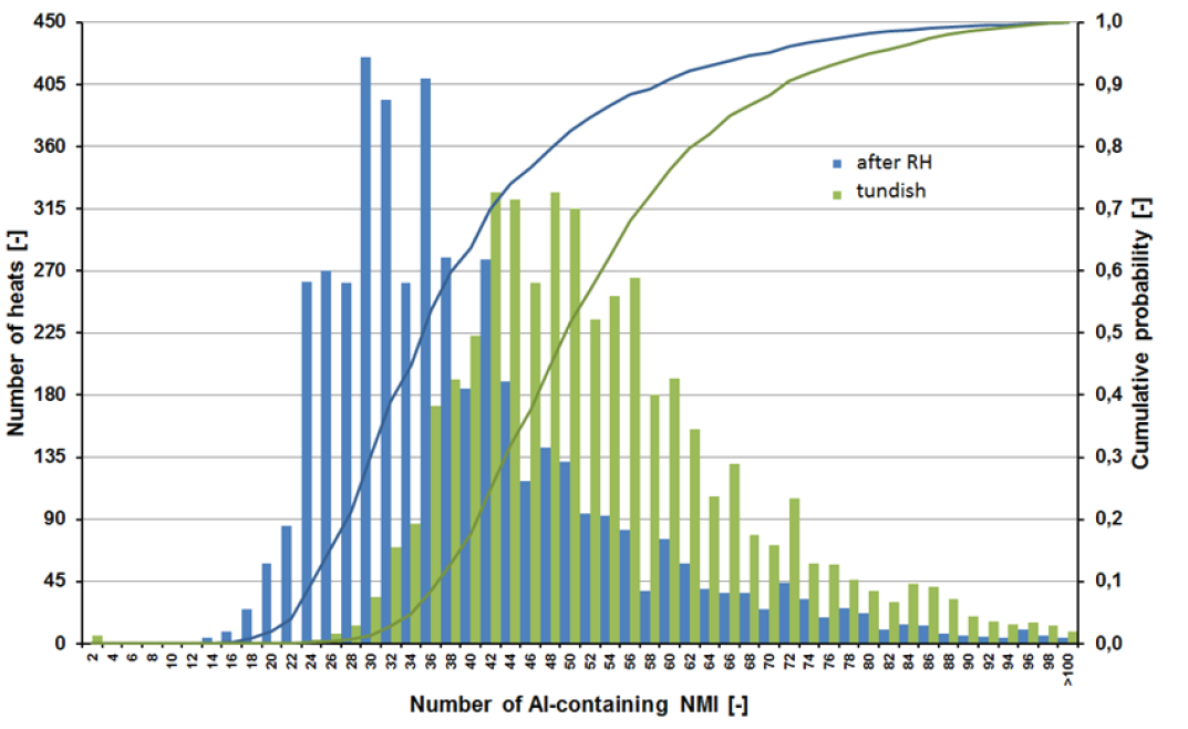已經(jīng)指出,在VASL鋼廠,由于RH脫氣手段,在連鑄過程中取樣分析顯示比RH脫氣后的非金屬夾雜物數(shù)量上升。計算出的全氧值在20ppm30ppm之間,這同樣適用于被調(diào)查的兩類鋼種。