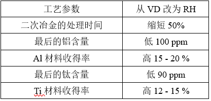 5總結(jié)了上述VDRH工藝比較的主要結(jié)果,得出的主要結(jié)論是二次冶金的RH工藝縮短50%時間,最終Ti-Al含量在RH路線較低,而Ti-Al的收得率較大。