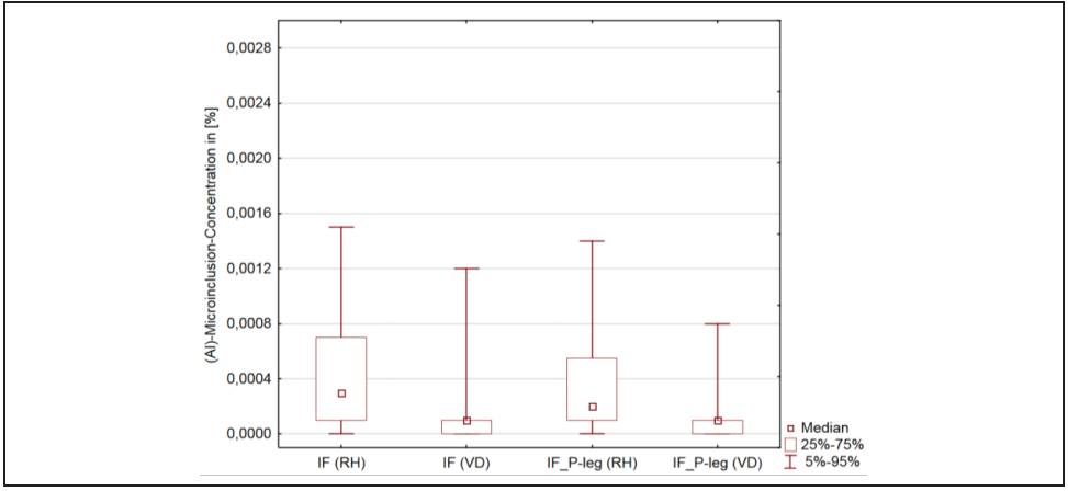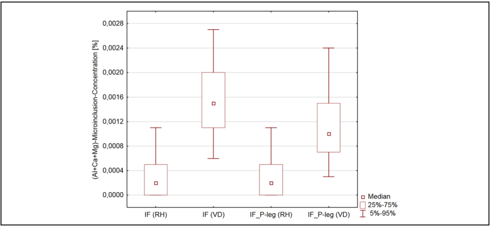 采用OES-PDARHVD兩種脫氣工藝的非金屬夾雜物進行分析,圖34顯示了在VDRH路線下IF鋼的微小夾雜物(Al+Ca+Mg)濃度含量。并對標準IF鋼種和磷合金IF鋼種牌號進行了進一步比較。箱形圖非常清楚地表明,RH脫氣工藝處理的鋼中微小的夾雜物的濃度含量比VD低的多,標準IF鋼和磷合金IF鋼之間不能觀察到顯著差異。