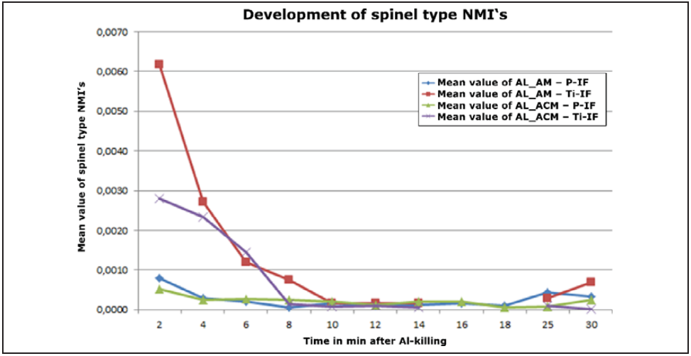 37  尖晶石型夾雜物NMI的平均值與鋁鎮(zhèn)靜后時間關(guān)系(VASL鋼廠)