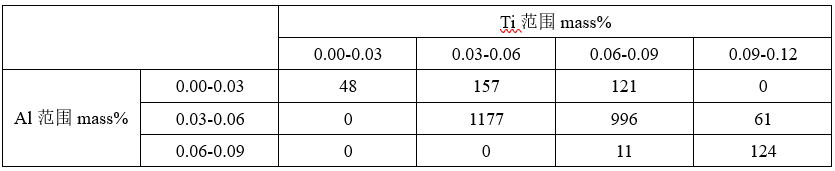 用于統(tǒng)計分析的樣本數(shù)見表7。很明顯,大部分爐次顯示Ti含量在0.06 ~ 0.09之間,對于其它鈦含量范圍的樣品數(shù)量很低,這在一定程度上與VASL鋼廠的爐次相反,后者的含鈦量較低的爐次較多。