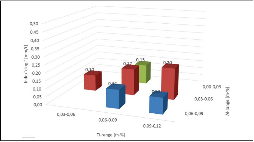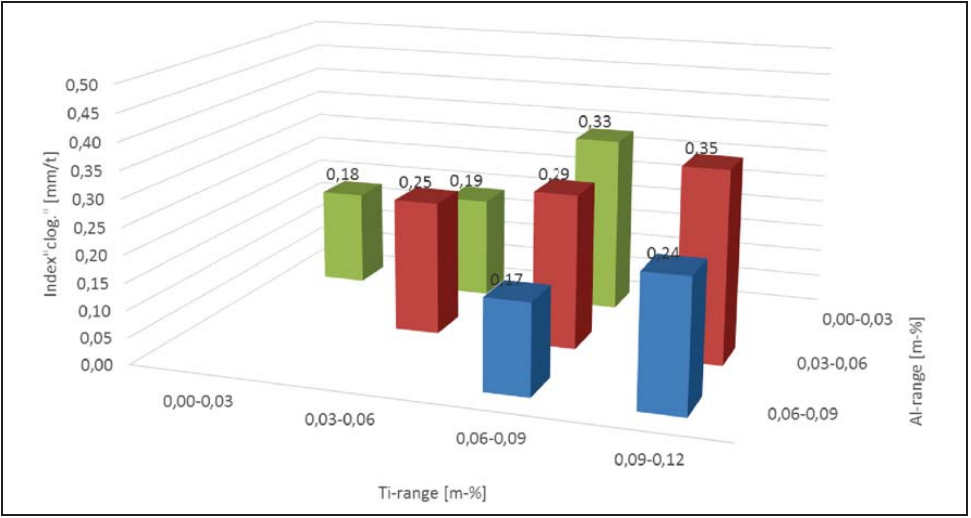 在圖44中,SALZF鋼廠的阻塞指數(shù)取決于TiAl的含量,正如在圖41中對VASL鋼廠所做的那樣。同樣,已經(jīng)觀察到的趨勢或多或少地變成了一個明顯的趨勢:隨著Ti含量的減少和Al含量的增加,堵塞的發(fā)生率降低。同樣,必須指出的是,在某些觀測范圍內(nèi),試樣數(shù)為零或很低。