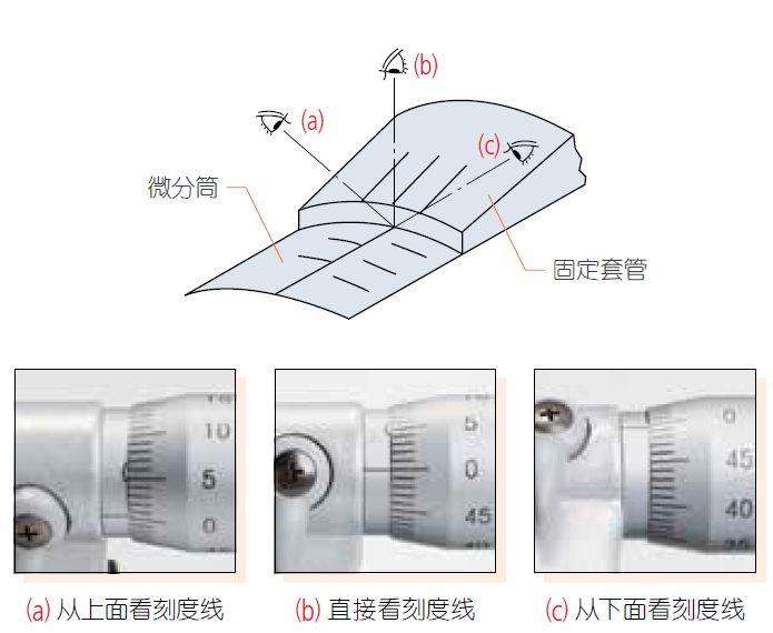 在讀取微分筒刻線時(shí),正確的姿勢(shì)即為:直視基準(zhǔn)線。如下圖示例: