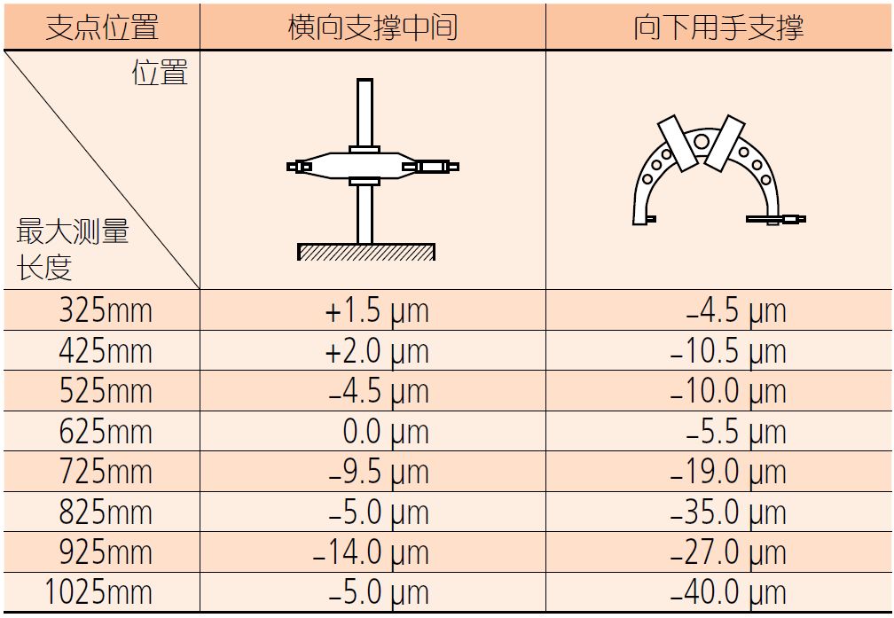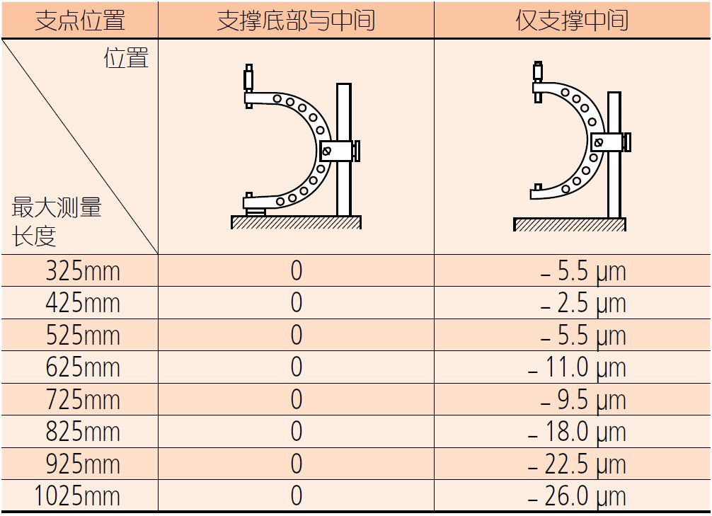 使用臺(tái)架時(shí),支點(diǎn)位置的選擇和千分尺的姿勢(shì)對(duì)測(cè)量結(jié)果會(huì)產(chǎn)生不同程度的影響。如下圖表所示。因此,在確定測(cè)量的姿勢(shì)后,需要進(jìn)行基點(diǎn)對(duì)準(zhǔn)再行使用。