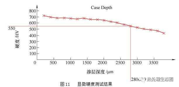 檢查發(fā)現(xiàn),齒輪的有效硬化層深度出現(xiàn)異常。熱處理工藝要求1.8mm(1.7~2.1mm),實(shí)際檢驗(yàn)實(shí)物齒輪有效硬化層深度2.8mm,如圖11所示。超出工藝要求0.7mm。