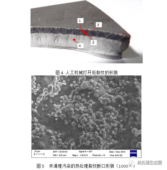 將裂紋斷口人工機(jī)械打開,如圖4所示。對斷口進(jìn)行電鏡觀察,裂紋斷口有污染物如圖5所示,經(jīng)過清理后,電鏡觀察其斷口形貌,其觀察點(diǎn)1、2、3、4的部位如圖4所示。其中觀察點(diǎn)1、2、3位于熱處理裂紋區(qū)-深色區(qū),相應(yīng)的斷口形貌如圖6、圖7、圖8所示;觀察點(diǎn)4位于靜斷區(qū)-淺色區(qū),相應(yīng)的斷口形貌如圖9所示。