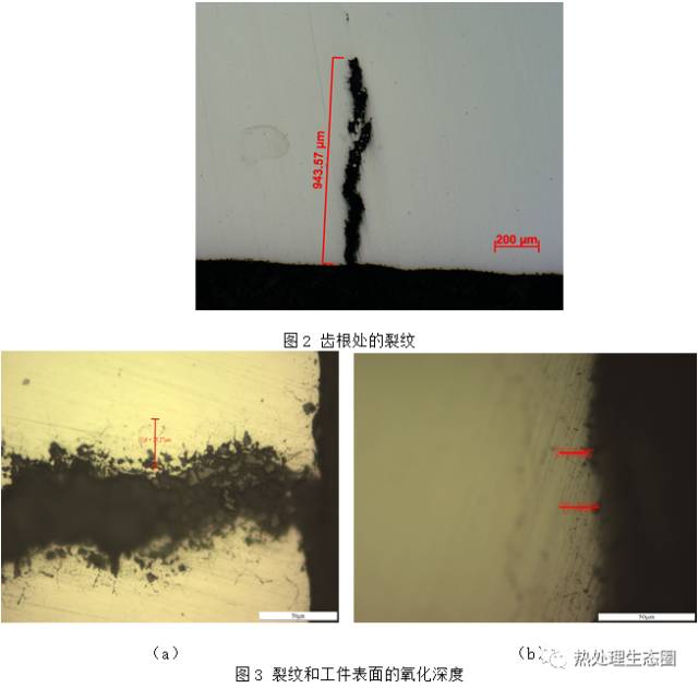 從主裂紋上取樣,制樣后在顯微鏡下(100×)觀察裂紋,發(fā)現(xiàn)沿齒根處的裂紋,其深度0.94mm,見圖2。裂紋及工件表面有氧化現(xiàn)象,見圖3。裂紋處的氧化深度(25.27μm),見圖3a。比工件表面的氧化深度(31.65μm)略淺,見圖3b。