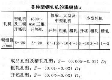 型鋼軋機(jī)輥縫值的大小取決于機(jī)架的構(gòu)造、軋制力的大小、軋輥直徑大小以及孔型的用途。對于壓下量很小的成品孔型和其他精軋孔型應(yīng)盡量選取小的輥縫值,以獲得幾何形狀正確和尺寸精確的產(chǎn)品;對于開坯孔型和延伸孔型,輥縫值的大小對產(chǎn)品形狀的正確性和尺寸精確性影響不大,所以輥縫值可適當(dāng)增大,以減少孔型切入軋輥的深度,增加軋輥重車系數(shù)和提高軋輥的使用壽命,同時也有利于采用調(diào)整輥縫值的辦法在同一個孔型中獲得各種高度尺寸的軋件,從而擴(kuò)大孔型的共用性,減少換輥次數(shù),提高軋機(jī)作業(yè)率。但是,輥縫值過大時,軋槽過淺,起不到限制金屬橫向流動的作用。輥縫值s一般根據(jù)表中所列經(jīng)驗數(shù)據(jù)選取。輥縫值有時也根據(jù)軋輥直徑D按下述經(jīng)驗關(guān)系式確定: