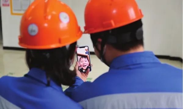 圖為堅(jiān)守在崗位的“夫妻檔”正與多日不見的孩子視頻
