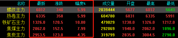 期鋼開盤漲停!期螺上漲340收報6012,漲幅5.99%;期卷上漲358收報6335,漲幅5.99%;鐵礦石同樣漲停,上漲120.5收報1326,漲幅10%;焦煤上漲152.5收報2062,焦炭上漲123收報2953.5。而現(xiàn)貨方面,受期鋼漲停影響,市場報價上調(diào)幅度較大,調(diào)價頻繁,螺紋鋼、熱卷、中板均價漲幅均在300以上。